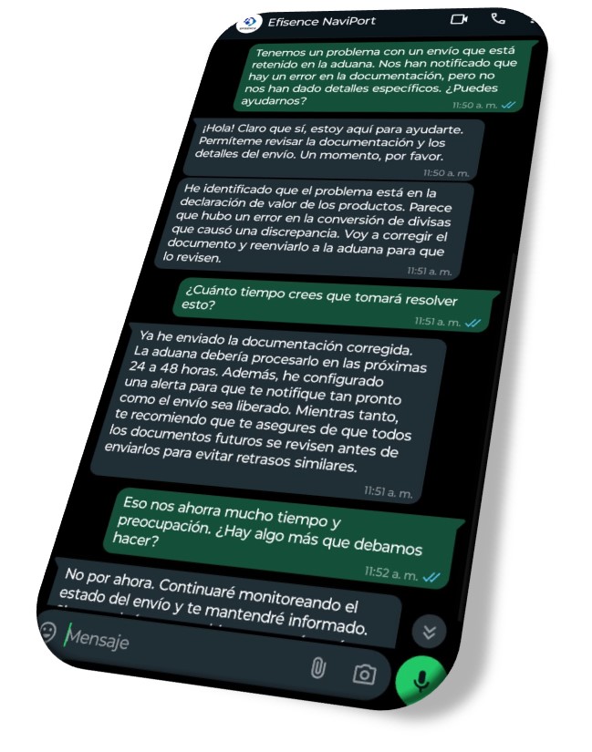 Una de las características más destacadas de NaviPort, nuestro asistente impulsado por inteligencia artificial, es su capacidad para interactuar en lenguaje natural a través de WhatsApp. Esta plataforma, ampliamente utilizada y familiar para la mayoría de las personas, permite a las empresas comunicarse con NaviPort de manera sencilla y accesible.