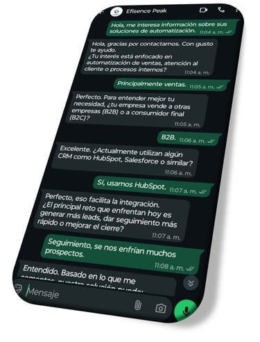 Una de las capacidades más potentes de Efisence Peak es su habilidad para interactuar en lenguaje natural a través de WhatsApp y otros canales digitales estratégicos para la empresa. Al operar dentro de una plataforma ampliamente utilizada y familiar para clientes, colaboradores y equipos internos, Peak elimina fricciones tecnológicas y facilita una adopción inmediata sin necesidad de capacitaciones complejas ni cambios drásticos en la operación diaria.
