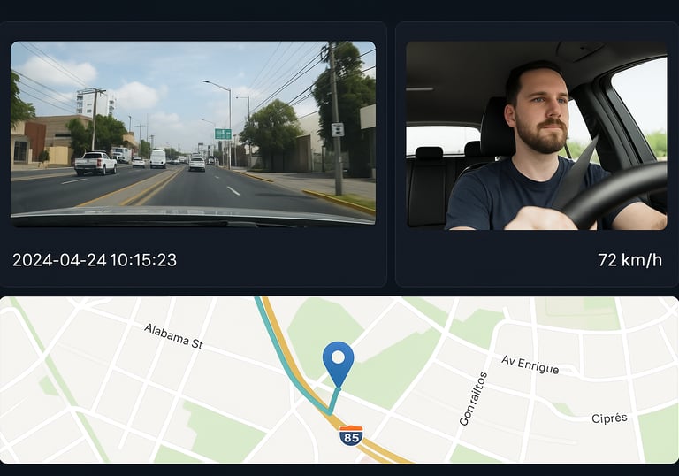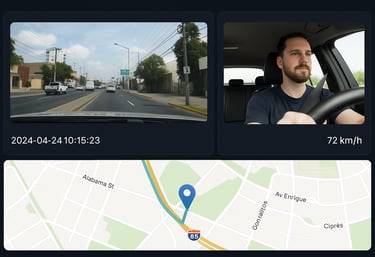 Las dashcams duales capturan video frontal e interior, integran alertas ADAS y DSM, y registran velocidad, ubicación GPS y eventos mediante G-sensor. Esta información permite detectar riesgos, analizar la conducción en tiempo real y generar evidencia confiable de cada incidente.